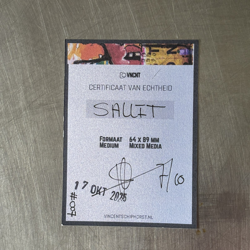 Deze specifieke kaart, getiteld ‘SALLIT’, is een handgemaakt Mixed Media werk. Door het compacte formaat is het een toegankelijke manier om originele kunst te verzamelen. Je kunt de kaarten bewaren in speciale verzamelalbums of ze in een klein lijstje presenteren als onderdeel van je interieur. Het werk is door mij persoonlijk gesigneerd, genummerd en wordt geleverd met een officieel certificaat van echtheid om de waarde en herkomst te garanderen.