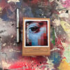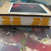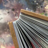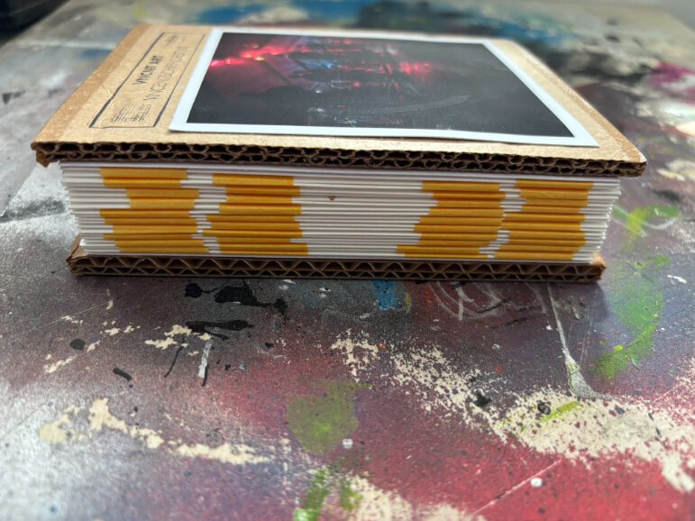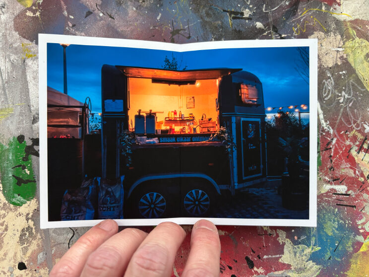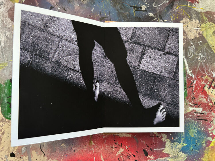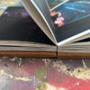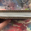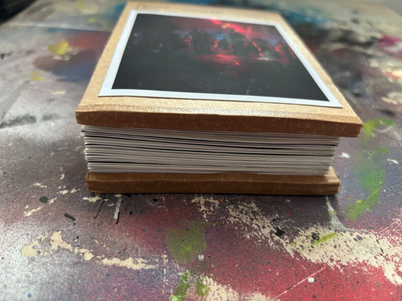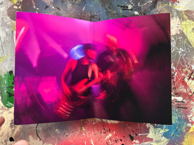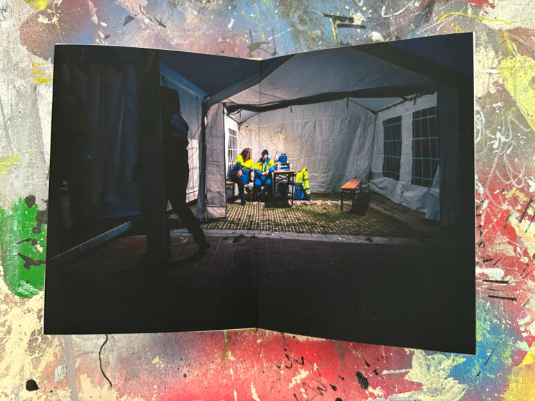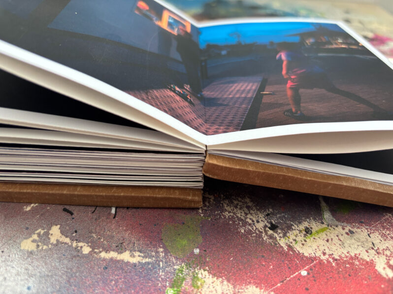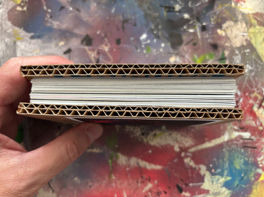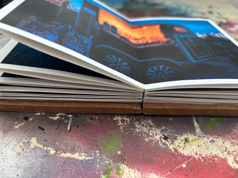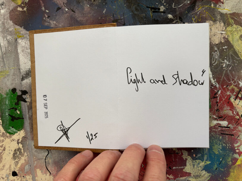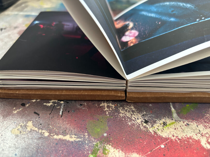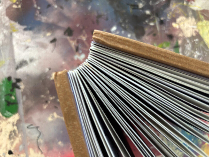 Ik gebruik een specifieke tapemethode om de pagina’s te binden. Hierdoor openen de pagina’s volledig vlak, wat essentieel is voor mijn composities die over de volledige breedte van 21 cm doorlopen. De front- en backcover verschillen per exemplaar, waardoor ieder van de 25 boekjes een eenmalig kunstwerk is binnen de editie.