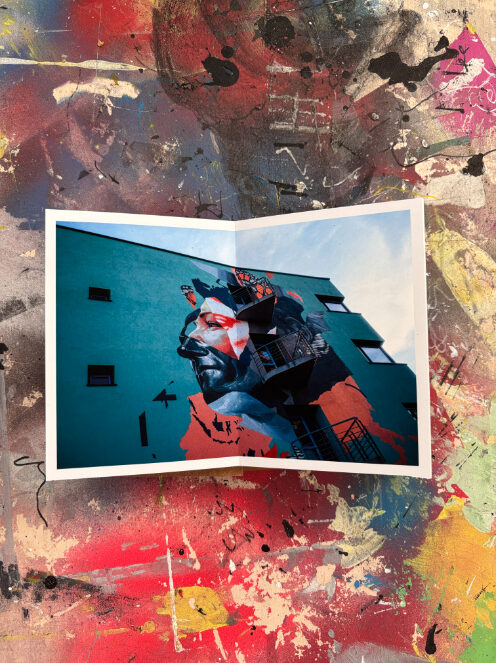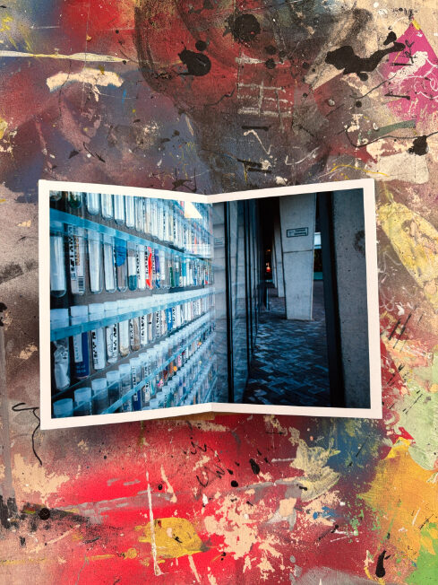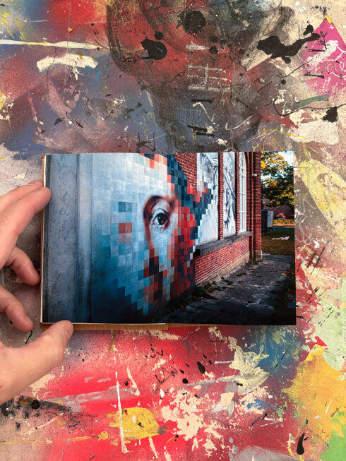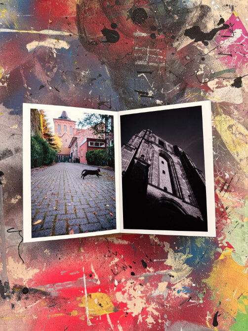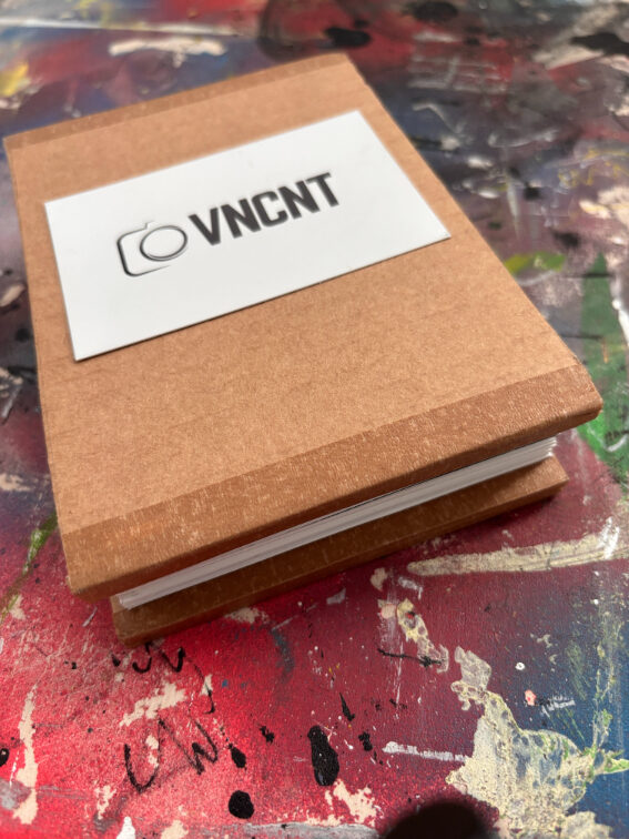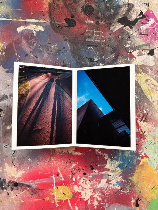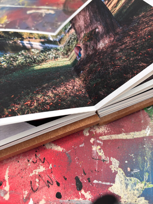 Ik maak elk boekje volledig met de hand in mijn atelier. De covers zijn vervaardigd uit gerecycled materiaal en voorzien van een merk- en datumstempel. Door de tapemethode liggen de pagina’s volledig vlak, waardoor de foto’s zonder onderbreking over de volledige breedte (21 cm) zichtbaar zijn. Geen enkel exemplaar is identiek; details in de cover en afwerking verschillen per stuk.